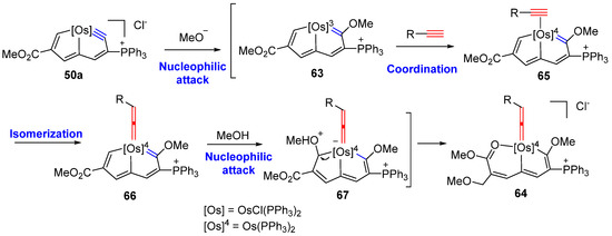 The rationale of the mechanism is depicted in Scheme 15. The combination of cesium carbonate and methanol would generate methanoxide, which conducted the first nucleophilic addition to a carbyne carbon, affording the metallapentalene intermediate 63. Subsequent coordination with a terminal alkyne led to the π-alkyne complex 65, which would form the vinylidene η1-complex 66 via isomerization. The α-carbon within the five-membered metallacycle was attacked by the second methanol molecule. Sequential ring opening, protonation and coordination of the ester group furnished the final fused metallafulvenallene complex 64.