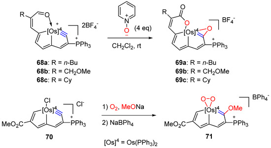 Very recently, oxygenation of osmapentalynes was reported by Xia’s group (Scheme 16). The first example was the oxygenation of the osmium carbolong complex ring [59]. Applying pyridine N-oxide as the oxidant, oxygen atoms were transferred to the metal–carbon triple bond in a nucleophilic reaction. Meanwhile, the labile aldehyde was oxidized to carboxylic acid, affording unprecedented OCCCO-type pentadentate chelates 69. The second example was the direct oxygenation of the metal center in the carbolong complex 70 [60]. The mixture of osmapentalyne 70 and excess sodium methoxide under oxygen atmosphere resulted in almost quantitative formation of osmapentalene 71, in which the dioxygen was bound to the metal center. The plausible mechanism was depicted as the nucleophilic attack at carbyne carbon atom by sodium methoxide, which led to the reduction of metal center and dissociation of chloride, which facilitated the coordination and the following reduction of dioxygen.