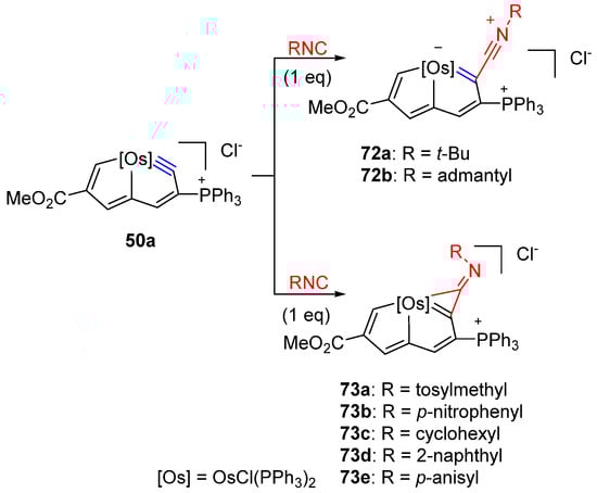 The direct attack of a free isocyanide on the carbyne carbon atom of the osmapentalyne 50a would lead to the formation of η2-iminoketenyl metallapentalene intermediates as well as the unprecedented metallaindene derivatives (Scheme 17). The steric hindrance of the bulky N-substituents tert-butyl or 1-adamantyl inhibited the bending at the isocyanide nitrogen, which prevented the formation of a η2-iminoketenyl structure and led to the osmapentalene 72a–b. In comparison to bulky isocyanides, other less bulky isocyanides could afford the desired metallacyclopropenimine complex 73a–e, which were often regarded as the intermediates in nucleophile-induced carbyne-isocyanide coupling processes. The intermediates with η2-iminoketenyl ligands had not been isolated and characterized until the η2-iminoketenyl metallapentalenes were documented by Xia and coworkers [61].