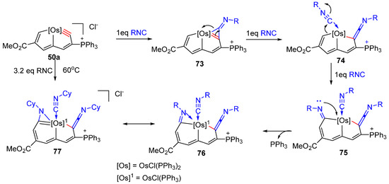 It is noteworthy that the addition of excess isocyanides at elevated temperature led to metallaindene derivatives, which represented the first metal-bridged polycyclic metallaaromatics [61]. Treatment of metallapentalyne 50a with the first isocyanide provided η2-iminoketenyl metallapentalene 73. The second isocyanide would coordinate with the osmium center to afford intermediate 74, which underwent sequential isocyanide insertion and coordination of a third isocyanide to generate intermediate 75. The exocyclic imine group could kick out one triphenylphosphine and coordinate with the osmium center, followed by subsequent aromatization to furnish metallaindene 77 (Scheme 18). The same research group extended the metallapentalene and metallaindene system to ruthenium except that the η2-iminoketenyl species were not observed [62].