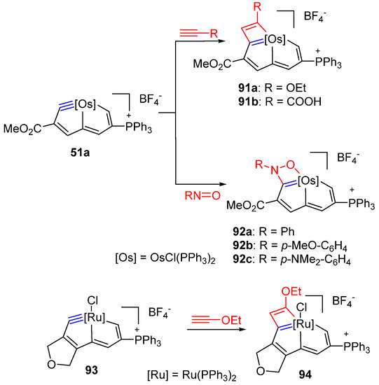 Treatment of the cationic osmapentalyne 51a with propionic acid or ethoxyacetylene provided the planar products 91a and 91b, respectively, through unprecedented [2+2] cycloaddition reactions of alkynes with a late-transition-metal carbyne complex [68]. It is noteworthy that two classical anti-aromatic frameworks, cyclobutadiene and pentalene, were stabilized by incorporating one transition metal fragment into the anti-aromatic systems, thus providing novel aromatic metallacycles. Complexes 91a and 91b constituted the first example of [2+2] cycloaddition products formed between a late-transition-metal carbyne with alkynes. Further inserti on was not observed in the presence of excess alkynes, thus preventing the formation of larger metallacycles. The reaction could be extended to early-transition-metal carbyne complexes. Treatment of ruthenapentalyne 93 with ethoxyacetylene furnished complex 94, which constitute the first [2+2] cycloaddition reaction of ruthenium carbyne complex with an alkyne [52]. The first [2+2] cycloaddition reaction of metallapentalyne 51a with nitrosoarenes (Ar–N=O) was documented by Xia et al. [69], affording well-characterized metallapentalenoxazetes 92a–c (Scheme 23). Faster reaction rate was observed provided that the electron-donating substituents were introduced to the para-position of the nitrosophenyl ring (92b–c), which could be attributed to the enhanced nucleophilicity of the nitrogen atom.