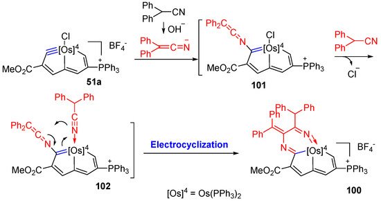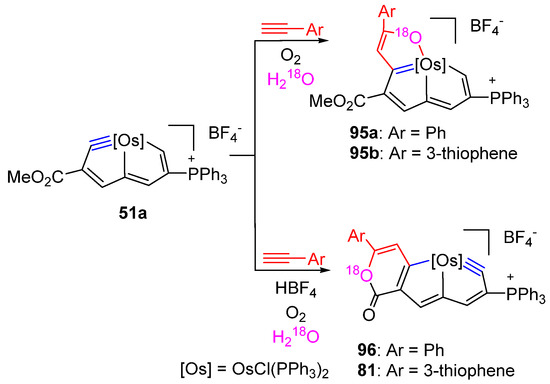 The [2+2] cycloadditions of osmapentalynes with alkynes were further investigated with different reaction conditions. In the presence of water and oxygen, osmapentalyne and arylacetylene were transformed to the first α-metallapentalenofuran 95. Furthermore, 18O labeling experiments suggest that the oxygen atom in the furan ring comes from water [66]. With the synthetic methodology in hand, modifications were carried out to install olefinic groups in the metallapentalenofurans, which were then subjected to polymerization to provide metallapolymers exhibiting excellent stimuli-responsive properties [74,75]. The lactone-fused metallapentalynes 81 and 96 were formed if tetrafluoroboric acid was also present. Interestingly, the metal–carbon triple bond in osmapentalynes 51a was shifted to another five-membered ring in complex 81 and 96 accompanied by the formation of new lactone ring (Scheme 24).