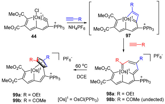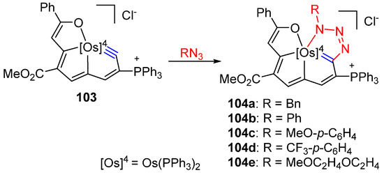 - Jia, G. Recent progress in the chemistry of osmium carbyne and metallabenzyne complexes. Coord. Chem. Rev. 2007, 251, 2167–2187. [Google Scholar] [CrossRef]