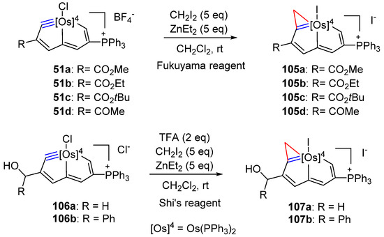 During the preparation of this manuscript, Xia and coworkers secured the Simmons-Smith reactions of substrates with metal–carbon triple bonds for the first time [72] (Scheme 29). Osmapentalyne 51a was transformed into cyclopropenation product 105a in the presence of classical Fukuyama reagent. The substrate scope was examined with electron-withdrawing substituents to give the expected cyclopropene products 105b–d in good yields. When the substituents were switched to carbinols, the Fukuyama reagent failed, and the more reactive Shi’s reagent was used to furnish the desired product 107. These results demonstrate that the reactions were sensitive to electronic effect, which was substantiated by theoretical calculations. Based on the results achieved, the Simmons–Smith reactions were also extended to ruthenapentalynes [72].