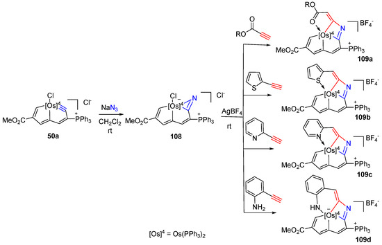 Unprecedented [3+1] cycloadditions of metalla-azirines with terminal alkynes were documented by Xia’s [73] group (Scheme 30). Osmapentalyne 50a was transformed into the metalla-azirine 108 in the presence of sodium azide. The reaction was the first synthesis of a metalla-azirine by [2+1] cycloaddition reaction of a metal carbyne with an azide and paralleled the first [3+2] cycloadditions of late-transition-metal carbyne with organic azides [71]. In the presence of AgBF4, a series of substituted terminal alkynes as well as metalla-azirine 108 were transformed to various tetracyclic complexes 109a–d. Moreover, the five coordinating atoms lie in the equatorial plane in the CCCCX-type (X = N, O, S) carbolong complexes obtained and the reaction provides a valuable supplement to the construction of planar pentadentate chelates.