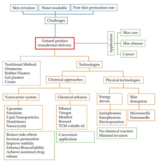 A natural product is a chemical compound or ingredients produced by a living organism. In the broadest sense, natural products include any substance yielded by life. Natural product application has more than 3000 years of history and includes many bioactive phytochemicals derived from plants and animals. Moreover, natural products have been recorded in many books in ancient China. The earliest is the “Wǔshí’èr bìng fāng” unearthed from Ma Wangdui. The first medical book in China, “Huángdì nèijīng·sù wèn”, had a discussion on the production and clinical application of plasters. In the Ming Dynasty, the “Běncǎo gāngmù Compendium of Materia Medica” recorded the application of topical plasters to treat gangrene and rheumatism. In the Qing Dynasty, topical plasters had become popular medicine. “Jí guǎng shēng jí” and “Lǐ lún piánwén” are two monographs in the history of China dealing with external treatments, clarifying the principles of external treatment and internal treatment. Many diseases are treated through the skin route. Our predecessors have long recognized some theoretical problems in the external application of herbal medicines plasters, such as acupoint application and meridian therapy. These theories have played a guiding role in the treatment of internal and external diseases of Chinese medical. Acupoint application of Chinese medicines often use a small dose of the medicine to achieve the effect compared to a larger oral dose [1]. Concerning the natural product application method, skin contact is with all of the body, including the heart, liver, spleen, lung and kidney; therefore, the ingredients penetrate each part. Placing natural products on the acupoint can treat illness, and exert some special efficacies. At present, transdermal natural products still have a mainly local effect [2]. Regular dosages are highly concentrated, and new technologies for prescription drugs are needed to overcome the skin barrier, especially the stratum corneum barrier, to improve the local consequence or systemic effects.