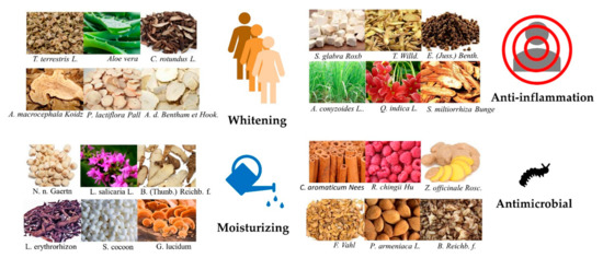 In ancient times, people used Impatiens balsamina Linn. to decorate the nails, applied natural indigo to draw the eyebrows, and used oil from animals to moisturize the skin. These are the original cosmetics made by herbal medicine. In related ancient books, Yang Kui Fei applied tài zhēn hóng yù gāo; Wu Zetian used tiān hòuyì mǔ cǎo miàn fang to remove spots; and the Empress Dowager used jiāyù róngsàn to care for her skin. According to Chinese medical books, the “Wǔshí’èr bìng fang” in the Warring States period recorded external application of Chinese medicine to remove warts and scars. Traditional eastern physicians paid attention to the cosmetics; Shennong Bencaojing, Taiping Shenghui Fang, and Compendium of Materia Medica include related records. The first book about Chinese medicine cosmetics is zhuāng tái fāng, which was published in the Sui Tang Dynasty. The pǔjìfāng was published in the Ming Dynasty and is currently known as the Chinese beauty collection. The book collected previous skin care formulas and promoted the development of traditional Chinese medicine cosmetics [112].