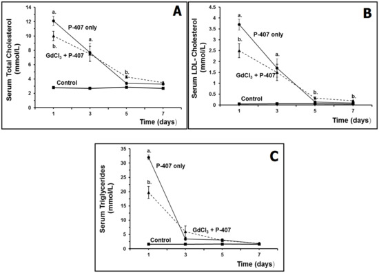 A mouse model of hyperlipidemia (developed by T.P. Johnston) induced by the administration of the block copolymer known as poloxamer 407 (P-407) has been widely used in experimental biology and medicine, see Johnston et al. for a comprehensive review of this model [103]. Using this well-documented mouse model of hyperlipidemia, it has been previously established that a single dose (300 mg/kg) of P-407 induces a significant increase in serum total cholesterol, LDL-C, and especially TG, at 24 h post-dosing when compared to saline-treated controls (Figure 1A–C), and that the hyperlipidemic state persists for approximately 5 days post-dosing, although TG returns to baseline (control) levels by three days following P-407 treatment (Figure 1C).