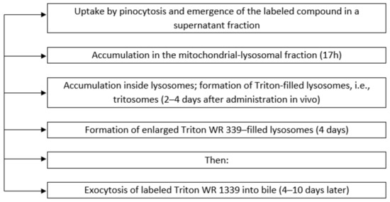 Wattiaux et al. [108] presented results that prove lysosomal localization of labeled Triton WR 1339 injected in vivo. Using methods of subcellular fractionation of rat liver homogenates in combination with centrifugation in a density gradient (Scheme 1), these authors demonstrated a similarity of distributions of radioactively labeled Triton WR 1339 and markers of lysosomal enzymes—acid phosphatase and other marker lysosomal enzymes—colocalized in the same peak [108]. It was shown that, similar to some labeled proteins (e.g., insulin), Triton WR 1339 first appeared in a supernatant fraction (slow uptake by fluid-phase pinocytosis), then “relocated” to the mitochondrial-lysosomal fraction, and ultimately reached the lysosomal peak on the 4th day after administration. The decreased density of the isolated tritosomes was a result of increased content of light lipids in these organelles, as well as the filling of tritosomes by light Triton WR 1339 [109]. The consequences of Triton WR 1339 accumulation were a significant increase in the number and size of lysosomes and changes in the inner structure of these organelles.