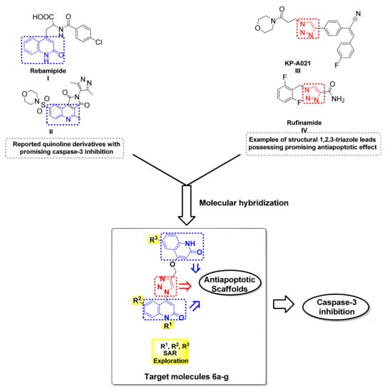 Examples of reported quinoline and 1,2,3-triazole based antiapoptotic drugs and caspase-3 and the design strategy for the target hybrids 6a–g.