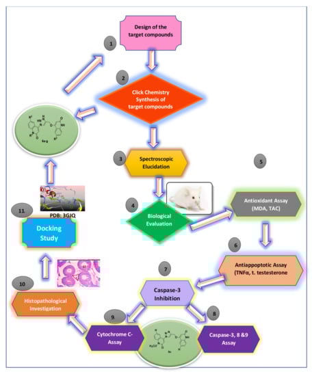 In response to the previously mentioned aspects, we here reported our medicinal chemistry efforts, starting from the core scaffold of caspase inhibitor that led to gathering two types of scaffolds, triazole and quinolin-2-one, respectively, in one compact hybrid to design simpler and more efficient antiapoptotic compounds investigating the caspase-3 inhibition to minimize, or even prevent, testicular I/R injury as illustrated in a summarized schematic diagram (Figure 2).