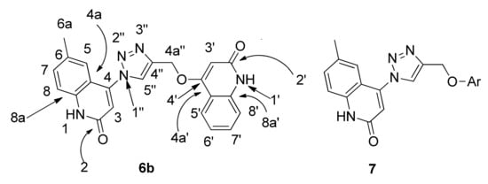 The structures of compounds 6a–g were confirmed by using different spectral data such as 1H-NMR, 13C-NMR, 2D-NMR, 15N-NMR, and mass spectrometry, as well as elemental analyses. For example, compound 6b was assigned as 6-methyl-4-(4-(((2-oxo-1,2-dihydroquinolin-4-yl)oxy)methyl)-1H-1,2,3-triazol-1-yl)quinolin-2(1H)-one. It exhibited a molecular formula of C22H17N5O3, representing a product from one molecule of 4b and one molecule of 5a without elimination. This result was further confirmed by mass spectrometry with m/z = 399 and elemental analysis (Figure 4). In the 1H-NMR spectrum of compound 6b, two quinolinone-NH protons appeared as broad signals at δH 12.22 and 11.44, one of them for the quinolinone carrying the triazole ring and the other one for the quinolinone initially carrying the propargyloxy group, respectively; these two protons were assigned exactly by analogy with compound 7 (Figure 4) [35] and from 2D-NMR (Table 2). Also, there were two doublets at δH 7.84 (J = 6.8 Hz; H-5′) and 7.30 (J = 7.4 Hz; H-8′), and five singlets at δH 8.98, 6.86, 6.22, 5.48 and 2.31, which were assigned as H-5″, H-3, H-3′, CH2 and CH3, respectively.