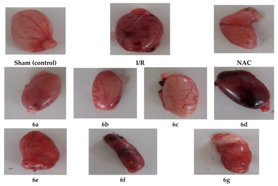 Photos of testicular specimens for groups of sham, I/R, reference (N-acetylcysteine, NAC) and treated with compounds 6a–g.