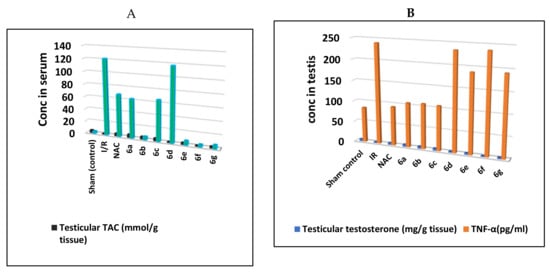 It was reported that excessive apoptosis in the testis could damage the Leydig cells and apparent decline in serum testosterone levels [56]. Furthermore, excessive apoptosis of Leydig cells results in decreased testosterone. The assays of the apoptotic biomarkers (testicular testosterone and TNFα) were done in comparison with the sham and NAC treated group and the results were outlined in Table S4 (Supplementary Materials). Groups of I/R and both compounds 6d and 6f showed a significant decrease in testicular testosterone with a significant increase in TNF-α when compared to sham control and NAC groups (Figure 6B). Interestingly, groups of compounds 6a–c showed a significant increase in testicular testosterone with a significant decrease in TNF-α in comparison to the IR group and relative to the reference NAC group. On the other hand, compounds 6e and 6g revealed remarkable testicular testosterone and TNF-α (Table S4 in Supplementary Materials).