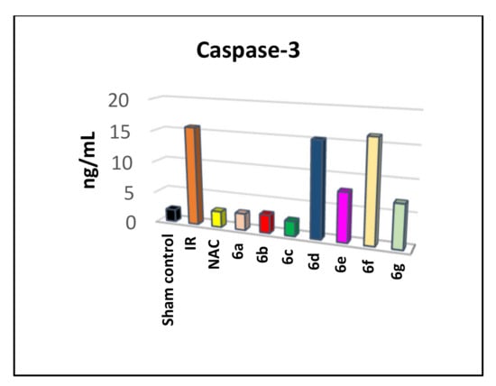 The above findings indicate a remarkable antiapoptotic activity of our target compounds that inhibition of caspase-3 might probably be the suggested target mechanism. Caspases can delay apoptosis, implicating a potential role in drug screening efforts [1]. Therefore, we studied the mechanism of the caspase-3 inhibition activity. Caspase-3 was assayed in the serum of rats treated with 6a–g in comparison with sham and the NAC treated group, as shown in Table S5 (Supplementary Materials). Groups of I/R and both compounds 6d and 6f showed significant caspase-3 when compared to sham control and NAC groups (Figure 7). Moreover, groups of compounds 6a–c showed a significant decrease in caspase-3 in comparison to the IR group and relative to the reference NAC group. On the other hand, compounds 6e and 6g displayed a remarkable testicular caspase-3 as in Table S5 (Supplementary Materials).