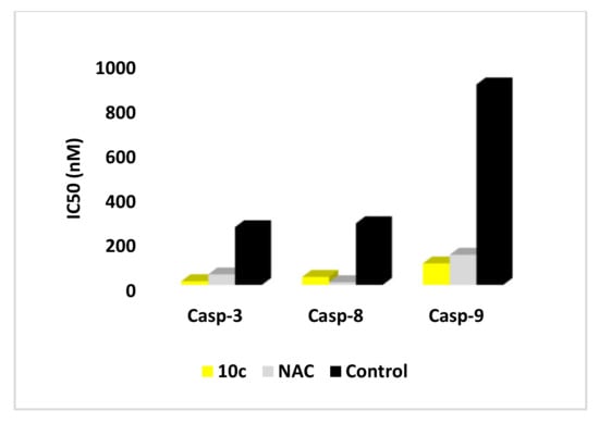 The assay utilizes synthetic peptide substrate DEVD-AFC (AFC, 7-amino-4-trifluoromethyl coumarin). Cell-based caspase-3, and proapoptotic caspase-8 and 9 cleave the synthetic substrate to release free AFC, which can then be quantified by fluorometry. Compounds to be screened can directly be added to the reaction, and the level of inhibition of caspase-3 activity can be determined by comparison of the fluorescence intensity in samples with and without the testing inhibitors. Compound 6c showed downregulation in the level of active caspase-3 with IC50 = 16.31 nM compared to NAC (IC50 = 46.83 nM) as shown in (Table S1, Supplementary Materials). Moreover, the effect of compound 6c on caspases-8 and 9 was also evaluated revealing a decrease in the levels of caspases 8 and 9 with IC50 = 35.57 and 96.24 nM, respectively, relative to NAC and compared to the untreated control (Figure 8). The data indicate that 6c is a putative inhibitor of both intrinsic and extrinsic caspase pathways with more selectivity and potency effect on caspase-3.
