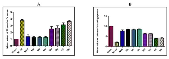 The histopathological findings of (A); Cosentino’s score, (B); Johnson’s scoring. Results were represented by the mean ± SE (n = 6).