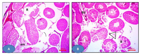 Photomicrographs of sections of the testis: (A,B) 6d and 6f respectively showed the ruptured seminiferous tubules (R) with distorted Leydig cells (triangles). Notice the dilated blood vessels (BV) and the amyloid substance (am). H&E × 100.