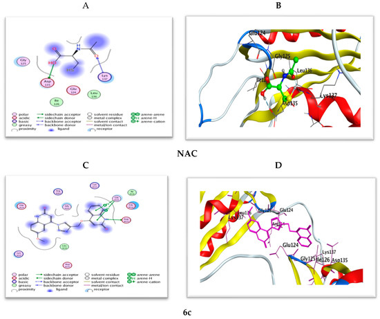 Most of the compounds showed interaction greater than NAC to interact with the same amino acids with an additional hydrophobic bond with GLY125, THR140, and PHE158. On the other hand, compounds 6f (Figure S2) dismissed hydrogen binding interactions with the amino acid residue ASP135 and LYS137. Also, compound 6c kept two hydrogen bond interactions with GLY125.