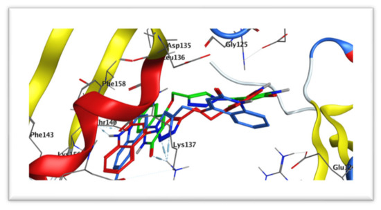 Recently, it is reported that an RMSD < 2.0 Å corresponds to good docking solutions. On the other hand, docking solutions with RMSD between 2.0 and 3.0 Å deviate from the position of the reference, but they keep the desired orientation. Finally, docking solutions with RMSD > 3.0 Å are completely wrong [61]. This could be explained by the fact that the highly active compounds 6b showed low RMSD refined (root mean square deviation refinement) values near to the pose of the co-crystallized ligand, which ensures both the validity of the docking protocol and the good interactions of the ligands and the main residues at the active site domain.