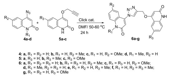 Aly et al. reported on the promising aspect of 3,3′-methylenebis(4-hydroxyquinolin-2(1H)-ones) as anti-Covid-19 [42]. In our present work, 1,2,3-triazoles were accessed by Huisgen type thermal 1,3-dipolar addition, which resulted in a mixture of 1,4- and 1,5-disubstituted triazoles [43]. The novel hybrids 6a–g were synthesized through click chemistry, which is a powerful tool for quick, highly selective, and reliable access to a reaction product with good yields. Therefore, we carried out the [3+2] cycloadditions of 4-azidoquinolin-2(1H)-ones 4a–d with 4-(prop-2-yn-1-yloxy)quinolin-2(1H)-ones 5a–c to give the corresponding 4-((1-(2-oxo-1,2-dihydroquinolin-4-yl)-1H-1,2,3-triazol-4-yl)methoxy)quinolin-2(1H)-ones 6a–g (Scheme 2).