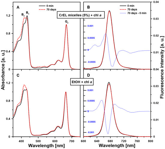 Room temperature electronic absorption and fluorescence emission spectra measured from chl a dissolved in the 5% Cremophor EL nano-emulsion (CrEL micelles (5%) + chl a; panels (A,B)) or 96% ethanol (EtOH+ chla a; panels (C,D)). The molar concentration of chl a in the samples was 10−5 M. The spectra were registered directly after the sample preparation (0 min, black solid line) and after 70 days of storage of the samples in the dark (70 days, red dashed line). The experiment was repeated three times (biological replicates). The representative results are included in the figure. The absorbance spectra were normalized in the Qy band and the fluorescence emission spectra were normalized to get the same area beneath each spectrum. In (B,D) panels, the difference spectra were added (70 days–0 min, blue thin line). The emission spectra were registered with the excitation at 434 nm.