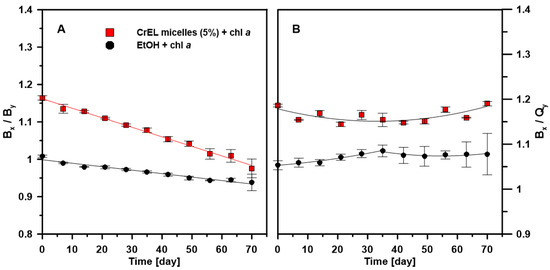 The decreasing pattern in the value of Bx/By ratio for chl a embedded in the CrEL micelles is similar to chl a dissolved in EtOH. The value of Bx/By ratio decreased linearly only by 13% and 9% for chl a in the CrEL micelles and EtOH, respectively. This phenomenon may suggest changes in the pigment monomer structure related to the electronic transition along the y-axis. Importantly, the ability to absorb the blue and red light by chl a expressed as the ratio of the main absorption maxima intensity (Bx/Qy) (Figure 3B) did not vary significantly after 70 days for both chl a dispersed in the CrEL nano-emulsion and EtOH.