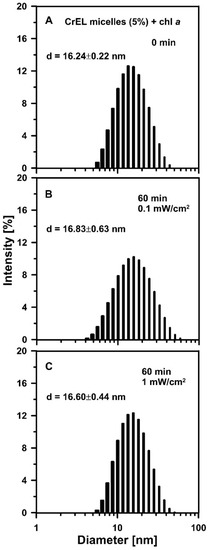 As can be seen in Figure 4, with 0.1 mW/cm2 and 1 mW/cm2 power density applicable for 1 h nano-micelles with the embedded chl a monomers exhibited excellent stability of an average diameter of ~16 nm.