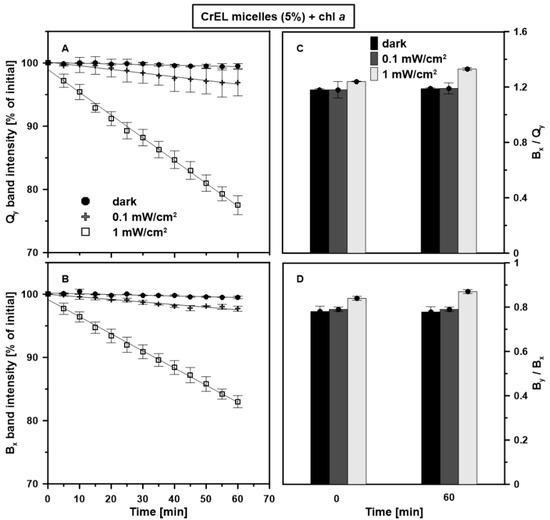 Photostability of chl a in the CrEL nano-micelles. Stability was expressed as the Qy and Bx bands intensity (panels: A,B), Bx/Qy and By/Bx ratios (panels: C,D) varying with illumination for 60 min. The molar concentration of chl a was 10−5 M. The samples were dark-adapted for 60 min (black circles) or illuminated with white light for 60 min. The power of light was 0.1 mW/cm2 (grey crosses) or 1 mW/cm2 (white squares). The experiment was repeated three times (biological replicates). The presented mean values ±SD are obtained on the basis of the absorbance spectra.
