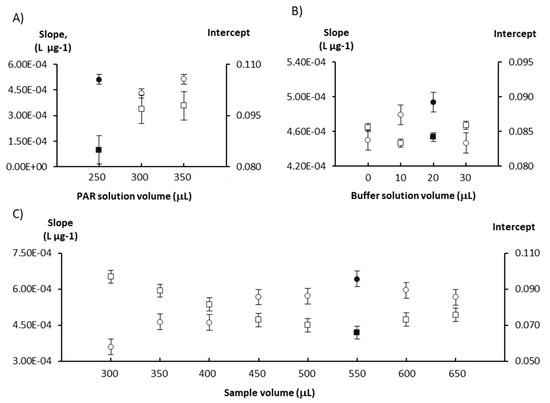 The first study carried out was on the PAR, sample and buffer solution volumes. Different volumes of PAR (250–350 µL), buffer (10–30 µL) and sample/standard (300–650 µL) solutions were studied to evaluate their impact on the calibration curve parameters (Figure 1). The increase in the reagent volume resulted in an increase of the intercept (≈15%) but no increase of sensitivity (calibration curve slope); thus, the lowest volume was selected to ensure minimal reagent consumption. The sensitivity increased with increasing the buffer volume up to 20 µL, with almost no variation in the intercept (<5% variation). A similar behavior was observed for the sample volume, as the sensitivity increased with the increase in the sample volume up to 550 µL, but in this case the intercept decreased. For higher sample volumes, the slope decreased slightly (≈10% variation) and the intercept increased slightly (≈10% variation).