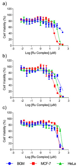 In vitro cytotoxicity tests of the synthesized ruthenium(II) compounds were carried out to establish their potential anticancer activities and to select the most active in this respect but, at the same time, the least harmful for healthy cells. A colorimetric MTT assay, that assesses cell metabolic activity, was used to determine cytotoxicity. This test is cost-effective, convenient and rapid [44]. The cytotoxicity of the complexes was seen to be strongly influenced by the chosen cell lines and by the structural features such as the ligand used. The IC50 values of HeLa, MCF-7 and BGM cells after exposure to a series of ruthenium(II) compounds for 48 h were calculated using a dose–response model, which was obtained from sigmoidal fitting of dose–response curves, as stated in the Experimental Section. The calculated IC50 values of the compounds and free ligands are shown in Table 4 and Table 5, respectively. The IC50 values of the ruthenium(II) compounds synthesized were compared in Table 4 with the values of cisplatin obtained from the literature [45,46] for the same cell lines. All complexes (except complex VI with Hela) were found to be less toxic than cisplatin with the cancer cell lines. Nevertheless, cisplatin is much more aggressive towards the BGM healthy cells. The differential selectivity of an anticancer drug towards cancer cells versus normal cells increases the likelihood of tumor-specific cytotoxicity, reducing the side effects in patients. The corresponding dose–response curves of Complexes II, III and VI are represented in Figure 1.