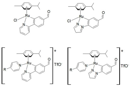 Complexes [(η6-p-cymene)Ru(CN)X]0/+ (X=Cl, py or 4-NMe2py) containing a cyclometalated 2-ppy or 1-ppz with a non-coordinated CHO [24].
