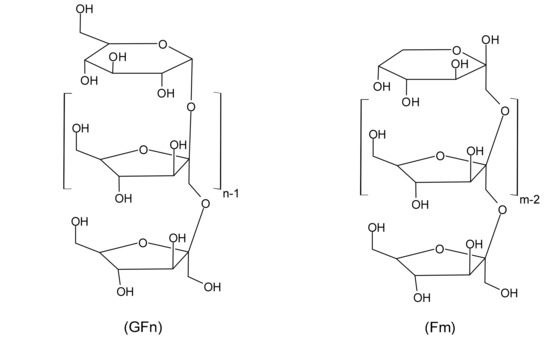 Inulin is a mixture of fructose polysaccharides (fructans), composed of chains larger than 12 units, that is synthesized inside of the plant as energy reserve; short inulin chains are called fructooligosaccharides (FOS) [7]. Figure 1 shows the chemical structure of inulin, the fructose units are linked by a β (1→2) bond and the terminal molecule can be a glucose or fructose, which are called d-glucopyranosyl (GFn) and β-d-fructopyranosyl (Fm), respectively [10,11]. Different studies have shown that inulin is a fiber that acts as a bifidogenic agent, stimulating the immune system, relieving constipation and reducing the risk of colon cancer [1,10,11,12,13]. In addition, it decreases the risk of osteoporosis, prevents atherosclerosis and reduces blood glucose levels [10]. Multiple applications of inulin in food, pharmaceutical and chemical industries can be attributed to its physicochemical properties and technological applications [14,15,16,17].