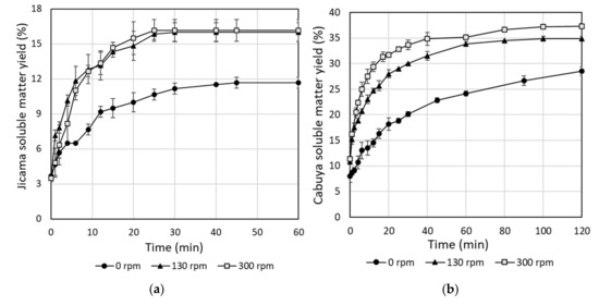 In this work, since higher carbohydrates contents were observed in jicama roots and cabuya meristem, the extraction of inulin from these vegetable materials was studied. As a first stage, the extraction process was evaluated in terms of the achieved soluble matter yield. For jicama and cabuya, the achieved soluble matter yield for different extraction times are depicted in Figure 2. As shown in this figure, there is a remarkable influence of the stirring speed on the soluble matter yield for both jicama and cabuya. However, the stirring speed has a higher influence on the soluble matter yield for cabuya than for jicama. All curves have an exponential behavior that converges to an equilibrium concentration. Clearly, the stagnant fluid layer around the solid particles causes the low efficiency obtained in the absence of agitation and this effect decreases when the mixture is stirred. However, when the thickness of this layer is below a critical value, the diffusion speed becomes independent of the stirring degree, as reported in literature [30]. The equilibrium concentrations were reached after 25 and 100 min for jicama and cabuya, respectively. For purposes of this work, this time is called the “equilibrium time.” Such difference in the extraction rate can be explained considering the physical properties of the vegetable materials; jicama has a higher content of water and is less compact than cabuya (and agave species in general) [2,26].