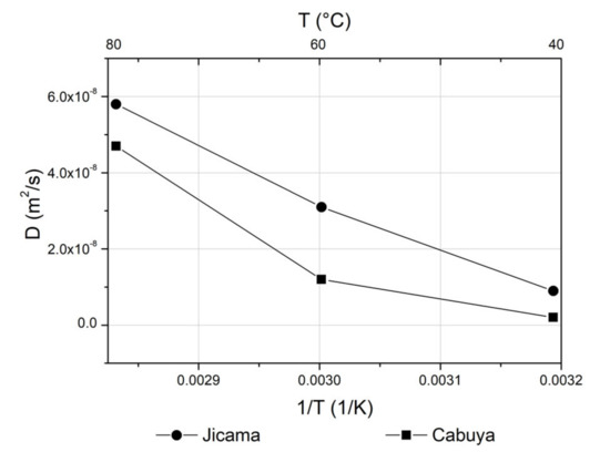 In addition, the effective diffusion coefficient was calculated as a function of temperature; Figure 4 shows the Arrhenius plots of the effective diffusion coefficients for jicama and cabuya. The two curves show a slight change of slope at 60 °C, more marked for the curve of jicama than for the curve of cabuya. These deviations were also observed in the past for beet and chicory [32] and are typically observed in extraction processes involving plant cells since there is a change in the magnitude of the resistance due to cell membranes [33].