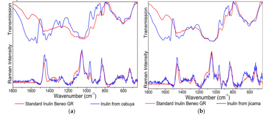 Comparison of the IR and Raman spectra of standard inulin and inulin from: (a) jicama and (b) cabuya.