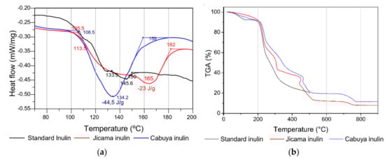 DSC and TGA thermograms of inulin from jicama and cabuya were compared with the corresponding thermograms of standard inulin (Figure 7). DSC thermograms, which are shown in Figure 6a, indicate that standard inulin starts melting around 133 °C and ends at 150 °C. Some thermal transitions can be distinguished in the thermogram of inulin from jicama; the decrease in baseline between 105 and 182 °C suggests a glass transition, and the glass transition temperature (Tg) would be around 113 °C. In an earlier study of the thermal properties of agave fructans, a glass transition event between 101.8 and 118.1 °C was identified, and a value of Tg of 109.6 °C was found [42]. In addition, the pseudo peak, with a minimum at 165 °C, could be related to a fusion process likely overlapped with devitrification. As a result, the melting process would start approximately at 113 °C and end at 182 °C, with a minimum of 165 °C and an associated melt energy of 23 J/g. In the thermogram of inulin from cabuya, a single fusion peak with an energy of approximately 44.5 J/g was observed. The melting process begins approximately at 106 °C and ends at 159 °C, with a minimum of 134 °C. The shape and width of the peak suggest a wide range of molecular weight distribution, which is in good agreement with an earlier report [43].