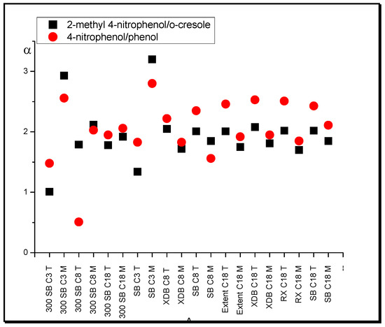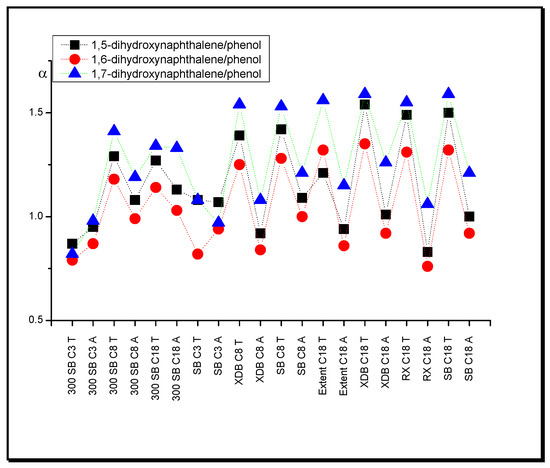 Based on retention data, one will notice that the substances with two OH groups (1,5-dihydroxynaphthalene, 1,6-dihydroxynaphthalene, 1,7-dihydroxynaphthalene) exhibit retention increase in comparison with the monofunctional solutes (phenol, o-cresol, p-cresol) in the THF system relative to that of ACN. This effect is caused by stronger hydrogen bond interaction of the solutes with tetrahydrofuran than with acetonitrile in the stationary phase region. The examples of separation factor (selectivity), α, values for naphthalene relative to phenol are presented in Figure 1.