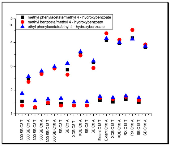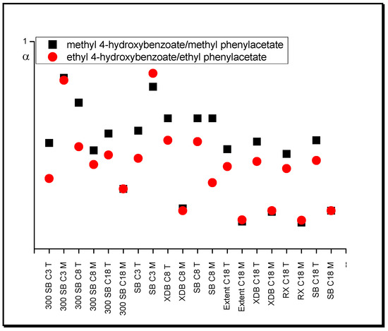 The influence of a hydroxyl functional group on substance retention can be observed when the retention of esters with a hydroxyl group (proton-donor group) is compared with the retention of those without this group. In systems with acetonitrile, the selectivity of the latter towards the former is quite high (from 2.5 to 4.2 for the pair methyl phenylacetate/methyl 4-hydroxybenzoate, from 1.9 to 4.5 for the pair methyl benzoate/methyl 4-hydroxybenzoate, from 2.6 to 4.2 for the pair ethyl phenylacetate/ethyl 4-hydroxybenzoate), and these values increase with increasing length of stationary phase chains (Figure 2). However, when tetrahydrofuran is used as a modifier, this value drops to approximately 1.5 for all columns. This proves the greater ability of THF to act as a proton acceptor in comparison with ACN [46].