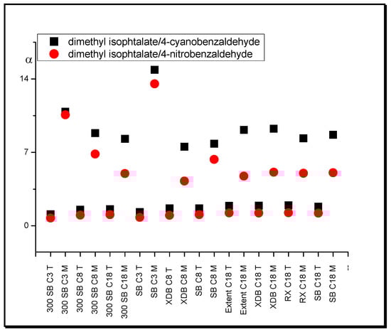 Another example of selectivity changes demonstrates the 4-nitrobenzaldehyde/4-cyanobenzaldehyde pair. The higher value of the retention of the first substance in relation to the second one in systems with THF compared with those with ACN is due to the stronger interaction of the tetrahydrofuran molecule with the NO2 group. On the other hand, the CN group is characterized by strong dipolar properties and capability for dipolar interaction with ACN in the stationary phase region. For this reason, 4-cyanobenzaldehyde exhibits greater retention relative to 4-nitrobenzaldehyde in ACN systems. The values of separation factor are very close for systems with all stationary phases except 300 SB C3, 300 SB C8, and 300 SB C18.