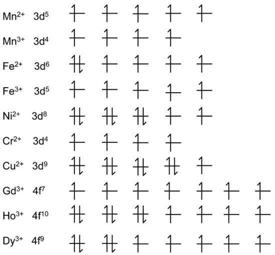The electron subshell diagrams of typical paramagnetic cations. Generally, the larger number of unpaired electrons leads to stranger magnetic resonance (MR) contrast.