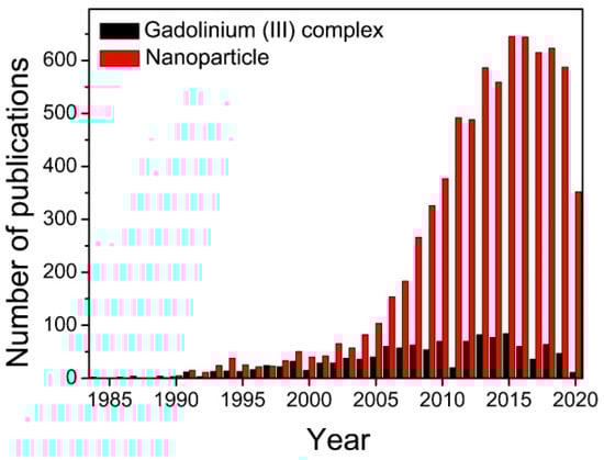 The number of publications searching for “magnetic resonance imaging and contrast agents” plus “gadolinium (III) complex” or “nanoparticle” in the “Web of Science”. Development of nanoparticle-based MRCAs has been the hot topic of the area since 2005.