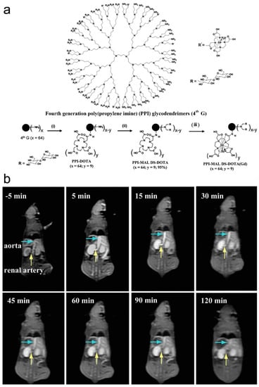 (a) Schematic illustration of the approach used to synthesize the PPI-MAL DS-DOTA(Gd), and (b) T1-weighted MR images of mouse aorta and renal artery at 5 min before injection (−5 min) and at 15, 30, 45, 60, 90, and 120 min post-injection of the PPI-MAL DS-DOTA(Gd) ([Gd3+] = 2 mg mL−1 in 0.2 mL saline through tail vein, adapted from Shi et al. 2016 [36], Copyright 2016 The Royal Society of Chemistry and reproduced with permission).