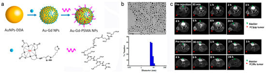 Au-Gd3+-prostate-specific membrane antigen (PSMA) NPs for MR-guided radiation therapy. (a) Schematic representation of Au-Gd3+-PSMA NPs. (b) TEM micrograph indicates that the average core size of Au-Gd3+-PSMA NPs is 5 nm, and DLS shows that the hydrodynamic diameter of Au-Gd3+-PSMA NPs is 7.8 nm. (c) In vivo tumor targeting of Au-Gd3+-PSMA NPs and MR imaging of PC3pip tumor-bearing mouse (up) and PC3flu tumor-bearing mouse (bottom) obtained at 7 T. PC3pip tumor cell expresses high level of PSMA, while PC3flu tumor cell expresses low level of PSMA (the mice were injected with Au-Gd3+-PSMA NPs at 60 μmol Gd3+⋅kg−1 through the tail vein, adapted from Basilion et al. 2020 [50], Copyright 2020 The American Chemical Society and reproduced with permission).