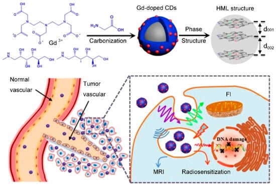 - Du, F.; Zhang, L.; Zhang, L.; Zhang, M.; Gong, A.; Tan, Y.; Miao, J.; Gong, Y.; Sun, M.; Ju, H.; et al. Engineered gadolinium-doped carbon dots for magnetic resonance imaging-guided radiotherapy of tumors. Biomaterials 2017, 121, 109–120. [Google Scholar] [CrossRef]