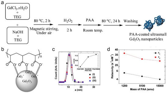 - Miao, X.; Xu, W.; Cha, H.; Chang, Y.; Oh, I.T.; Chae, K.S.; Tegafaw, T.; Ho, S.L.; Kim, S.J.; Lee, G.H. Ultrasmall Gd2O3 nanoparticles surface-coated by polyacrylic acid (PAA) and their PAA-size dependent relaxometric properties. Appl. Surf. Sci. 2019, 477, 111–115. [Google Scholar] [CrossRef]