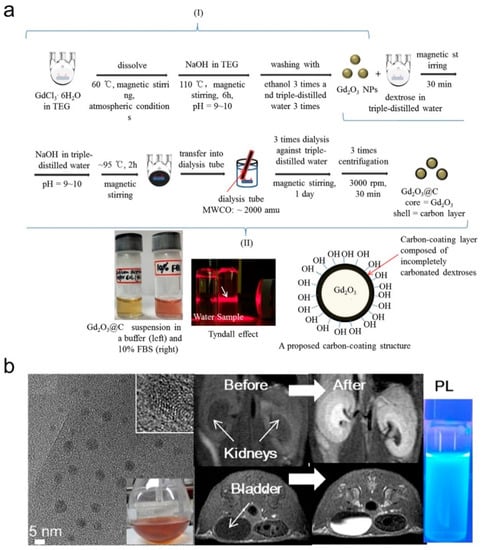 - Yue, H.; Marasini, S.; Ahmad, M.Y.; Ho, S.L.; Cha, H.; Liu, S.; Jang, Y.J.; Tegafaw, T.; Ghazanfari, A.; Miao, X.; et al. Carbon-coated ultrasmall gadolinium oxide (Gd2O3@C) nanoparticles: Application to magnetic resonance imaging and fluorescence properties. Colloid. Surf. A 2020, 586, 124261. [Google Scholar] [CrossRef]