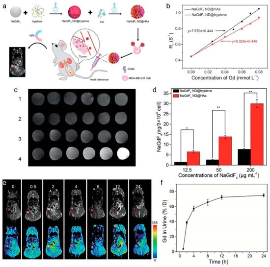Taking benefit from robust Gd3+-phosphate coordination bonds, our group developed a facile method for transferring hydrophobic NaGdF4 NDs into aqueous phase though ligand exchange reaction between oleate and phosphopeptides in tryptone [86,87]. The tryptone-coated NaGdF4 NDs (tryptone-NaGdF4 NDs) have excellent colloidal stability, low toxicity, outstanding MRI enhancing performance (r1 = 6.745 mM−1⋅s−1), efficient renal clearance, and EPR effect-based passive tumor-targeting ability. Importantly, the tryptone-NaGdF4 NDs can be easily functionalized by other molecules including organic dyes and bioaffinity ligands. As shown in Figure 9, the tryptone-NaGdF4 NDs were further functionalized by hyaluronic acid (HA, a naturally occurring glycosaminoglycan) [87]. The HA functionalized tryptone-NaGdF4 NDs (tryptone-NaGdF4 ND@HAs) exhibit high binding affinity with CD44-positive cancer cells, good paramagnetic property (r1 = 7.57 mM−1⋅s−1) and reasonable biocompatibility. Using MDA-MB-231 tumor-bearing mouse as a model, the in vivo experimental results demonstrate that the tryptone-NaGdF4 ND@HAs cannot only efficiently accumulate in tumor (ca. 5.3% injection dosage (ID) g−1 at 2 h post-injection), but also have an excellent renal clearance efficiency (ca. 75% ID at 24 h post-injection). The approach provides a useful strategy for the preparation of renal clearable MRCAs with positive tumor-targeting ability. Using a similar phase transferring principle, the peptide functionalized NaGdF4 NDs (pPeptide-NaGdF4 NDs) were prepared by conjugation of the hydrophobic oleate coated NaGdF4 NDs (4.2 nm in diameter) with the mixture of phosphorylated peptides including a tumor targeting phosphopeptide (pD-SP5) and a cell penetrating phosphopeptide (pCLIP6) [88]. Due to its high isoelectric point, the pCLIP6 can enhanced the cellular uptake of pPeptide-NaGdF4 NDs. The pD-SP5 can improve the tumor-targeting ability of pPeptide-NaGdF4 NDs because it has high binding affinity to human tumor cells. The pPeptide-NaGdF4 NDs show low toxicity, outstanding MRI enhancing performance (r1 = 13.2 mM−1⋅s−1) and positive-tumor targeting ability, which were used successfully as efficient MRCA for an in vivo imaging small drug induced orthotopic colorectal tumor (c.a., 195 mm3), when the mice were then intravenously injected with pPeptide-NaGdF4 NDs at a dose of 5 mg Gd kg−1. In addition, the half-life of pPeptide-NaGdF4 NDs in blood is found to be 0.5 h, and more than 70% Gd is excreted with the urine after 24 h intravenous administration.