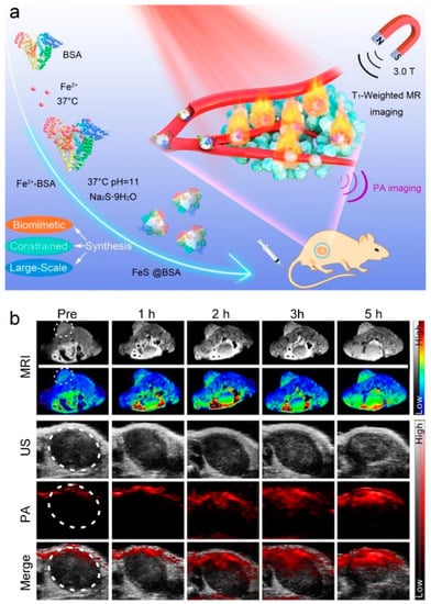 (a) Schematic representation of bovine serum albumin (BSA)-constrained biomimetic synthesis of 3 nm FeS@BSA for in vivo T1-weighted MR/phototheranostics dual-mode imaging-guided photothermal therapy (PTT) of tumors. (b) In vivo T1-weighted MR, US, PA, and merged (US and PA) images of tumor after intravenous injection of at a dose of 20 mg FeS@BSA kg−1 (adapted from Zhang et al. 2020 [104], Copyright 2020 Elsevier Ltd. and reproduced with permission).