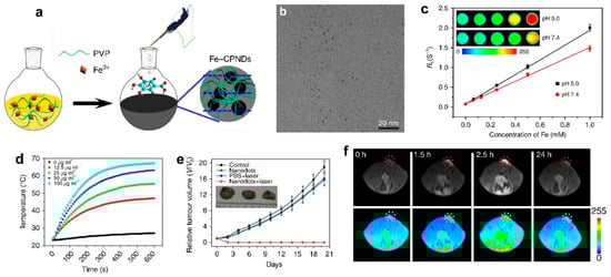Fe3+ coordination polymer NDs (Fe-CPNDs) were synthesized through the self-assembling the multidental Fe3+-polyvinyl pyrrolidone (PVP) complexes and Fe3+-gallic acid (GA) complexes and used as nanotheranostics for MRI-guided PTT [107,108,109]. For instance, our group has developed a simple and scalable method for synthesizing the pH-activated Fe coordination polymer NDs (Fe-CPNDs) by the coordination reactions among Fe3+, GA, and PVP at ambient conditions (as shown in Figure 11) [107]. The Fe-CPNDs exhibit an ultrasmall hydrodynamic diameter (5.3 nm), nearly neutral Zeta potential (−3.76 mV), pH-activatable MRI imaging contrast (r1 = 1.9 mM−1⋅s−1 at pH 5.0), and outstanding photothermal performance. The Fe-CPNDs were successfully used as T1-weighted MRCA to detect mouse-bearing tumors as small as 5 mm3 in volume, and as a PTT agent to completely suppress tumor growth by MRI-guided PTT, demonstrating that Fe-CPNDs constitute a new class of renal clearable theranostics. In addition, the Fe-CPND-enhanced MRI was successfully employed for noninvasively monitoring the kidney dysfunction by drug (daunomycin)-induced kidney injury, which further highlights the potential in clinical applications of the Fe-CPND [108].